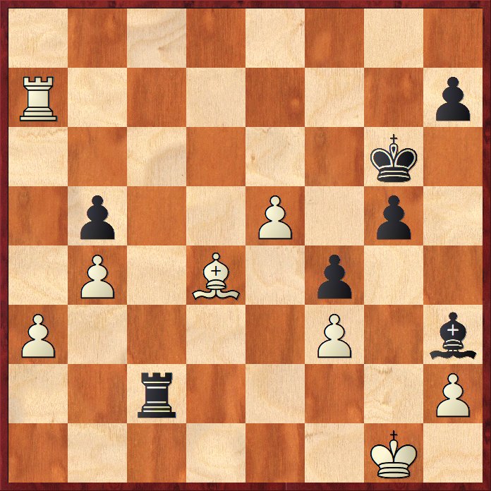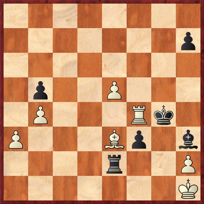 I rond sju hade jag vunnit över IM Herman Grooten. Här i sista ronden möter jag hans son. I den ömsesidiga tidsnöden har grabben just slängt in Sf5-g3 och jag ser ut att ha spelat bort mitt vunna slutspel. Om tornet flyttar ryker ju springaren efter Tf5+. Men det finns ett mothot …