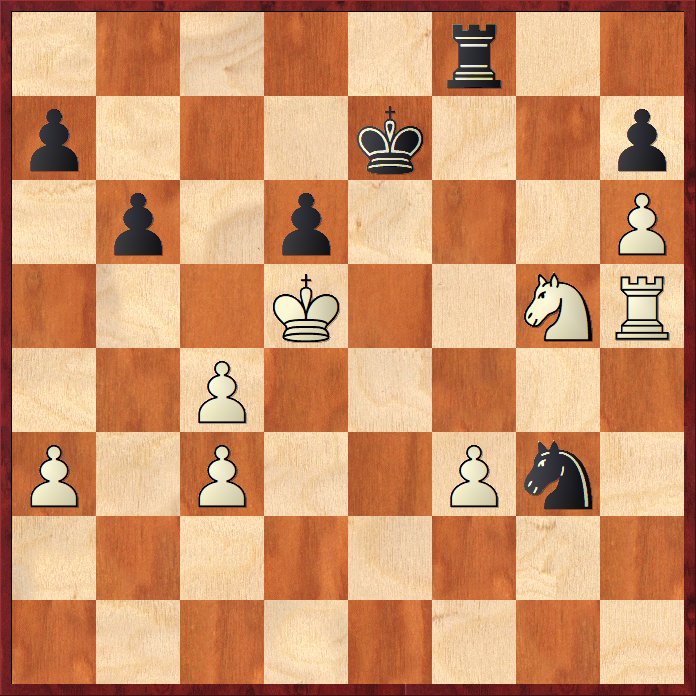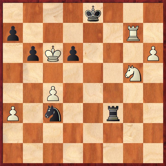 Eller 47… Nxh5 48. Nxf8 Nf6+ 49. Kc6 Kxf8 50. Kxd6 och vits bönder avgör. Springaren har i allmänhet svårt att få bukt med en fribonde ute på kanten.