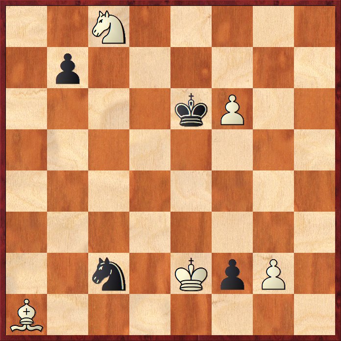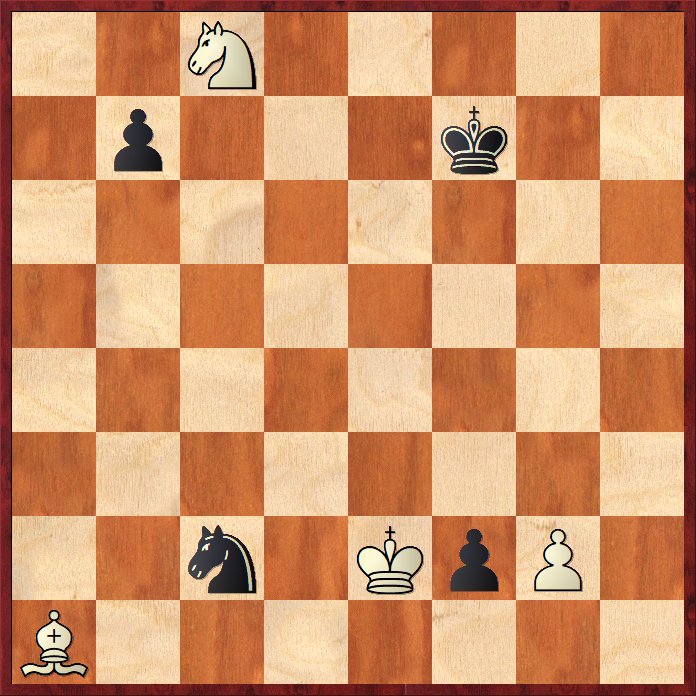 Vit ser ut att vinna lätt med sin merpjäs, men ser man närmare på det så är vits löpare fångad trots den långa diagonalen, antingen direkt eller indirekt på 4 fält.