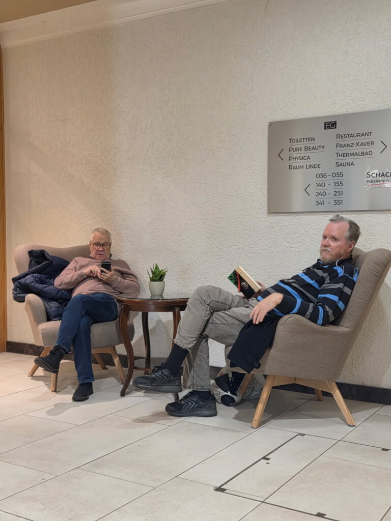 Matti Svenn och Lars Madebrink laddar upp i lobbyn inför rond 5. Foto: Lars Blomström