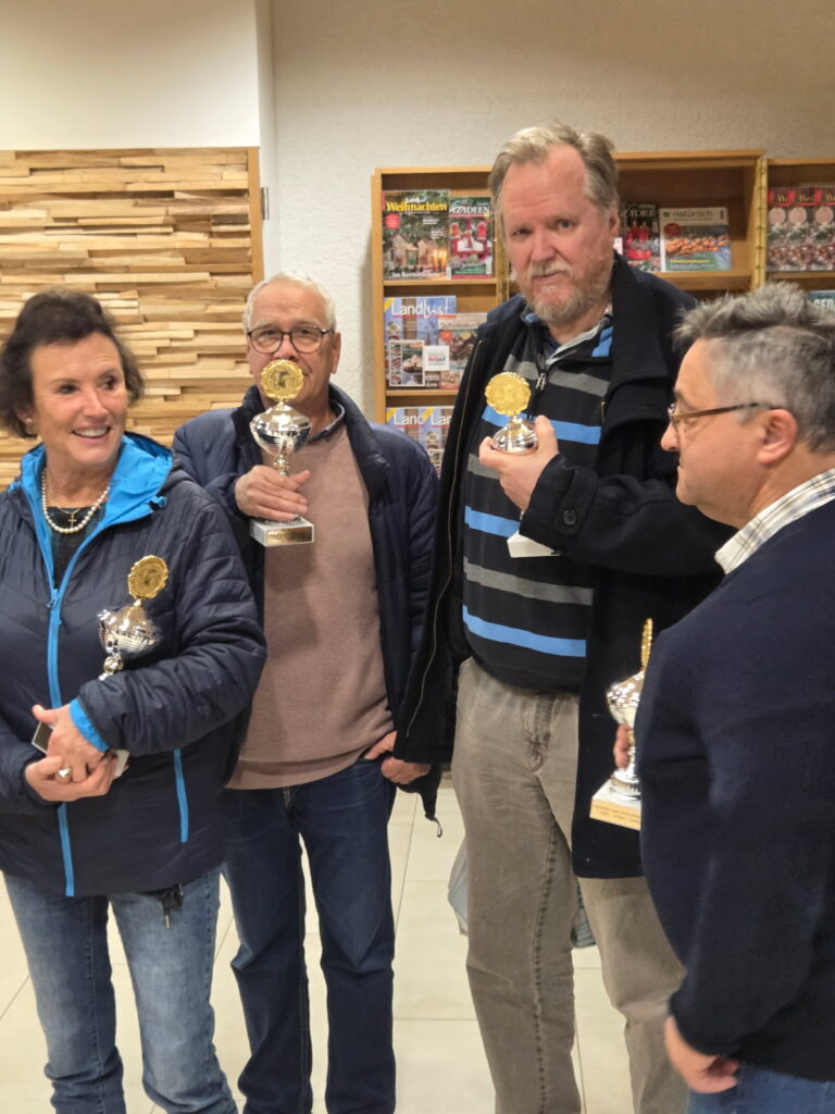 Matti Svenn och Lars Madebrink i mitten av bilden med varsin pokal som belöning som bästa 70+ och 60+. Foto: Lars Blomström