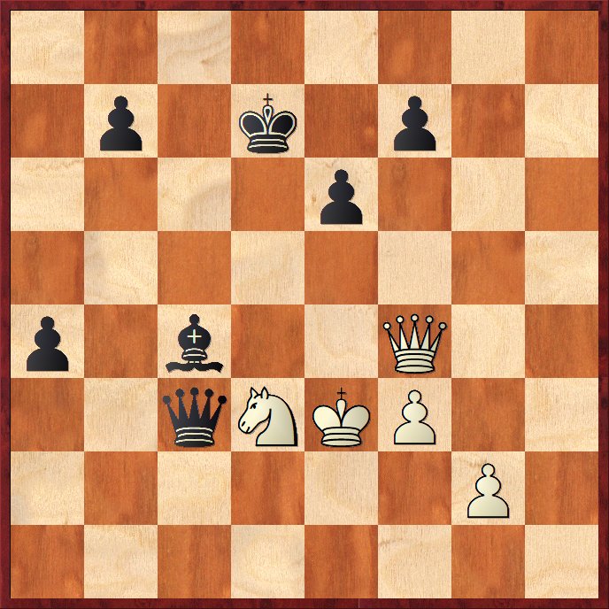 4.) Svart missade 33…Sxg5 34.Dxg5 Th3! och den svarta damen hade spelat en avgörande roll, c3 är ogarderbart. Vit hade i slutskedet i första hand riktat in sitt försvar mot punkten c2. (Innan dess stod han rätt bra). Efter textdraget är det gonatt, t.ex 35.fxe6 Dxc3+ 36.Kd1 Da1+ 37.Dc1 Dxd4+ osv. Verkar som schackgudinnan Caissa har bistått mig under hösten. Så var det även i nästa ställning.