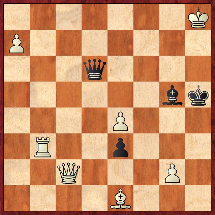 1.Da1+ Inte det närliggande 1.Df6+ för 1…Sg7 2.Kh4 hxg4. Vit ska förlora ett drag och vinna på dragtvång. 1…Sg7 2.Df6 Da3+ Segare än 2…hxg4+ 3.Kh4 3.Kh4 Df8 4.Kg5! hxg4 Kungen gömmer sig efter 4…Dc5+ 5.Kh6 De3+ 6.g5 5.Kh4!